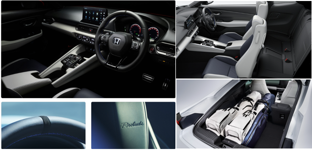 インテリアはホワイトを基調として深いブルーを配した「ブルー×ホワイト」がメインカラーでDシェイプデザインのステアリングホイール、メタル製のパドル、PRELUDE専用のフルグラフィックメーターなどが装備されています。