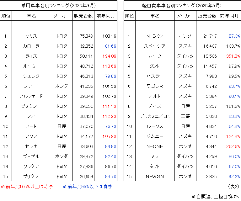 登録車ランキングは15位中、11車種を占めており、8月から1車種増加しています。1~10位まで8月と同じ顔ぶれですが1位はトヨタ「ヤリス」が13ヶ月連続首位を維持、3位のトヨタ「ライズ」は前年同月比の2倍近い台数となっています。