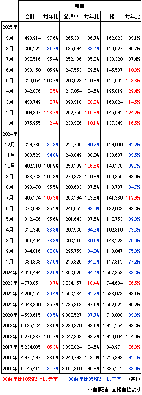 日本自動車販売協会連合会と全国軽自動車協会連合会が発表した9月の新車登録台数は、前年同月比2.4%減の428,214台3ヶ月連続前年割れとなりました。(表1)