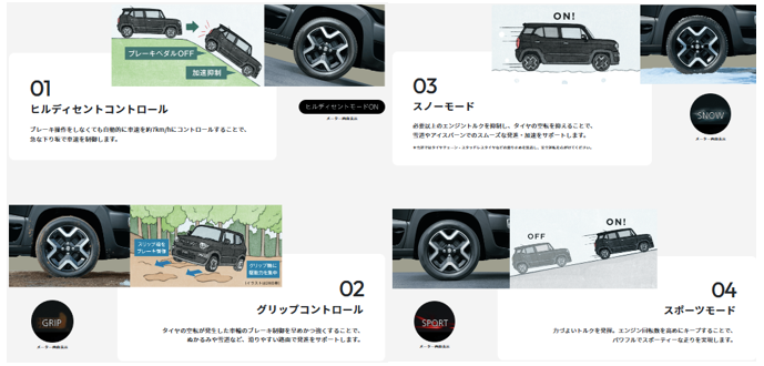 スイフトやソリオに搭載しているZ12E型エンジンとCVTを採用、スポーツモード、スノーモード、グリップコントロール、ヒルディセントコントロールを2WD車にも採用、コーナリング時の膨らみを抑えるアクティブコーナリングサポートを採用しています。