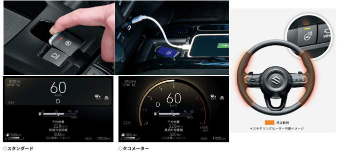 パーキングブレーキの作動、解除の操作を指先で行うことができる電動パーキングブレーキ(ブレーキホールド付)を採用、ステアリングヒーターや急速充電に対応したUSB電源ソケット[Type-C、PD対応](2個)を採用しています。スズキ国内初となる7インチメーターディスプレイ(カラー)が標準装備となっています。