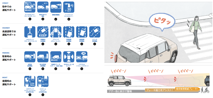ミリ波レーダーと単眼カメラの組み合わせで検知対象を車両や歩行者、自転車、自動二輪車まで拡大した交差点での検知にも対応した衝突被害軽減ブレーキ「デュアルセンサーブレーキサポートⅡ」を採用しています。