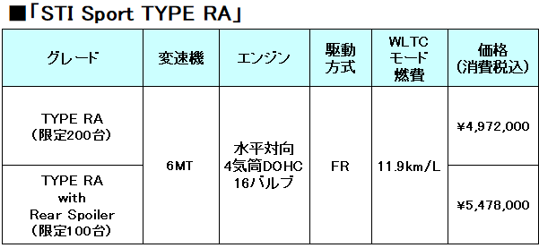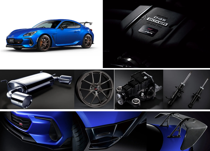 ZF製フロント&リヤダンパー、STI製BBS18インチ×7.5Jアルミホイール(マットグレイ/マットブロンズ)、brembo製フロント(17インチ対向4ポット)&リヤ(17インチ対向2ポット)、ベンチレーテッドディスクブレーキ(ゴールドキャリパー)、冷却フィン付リヤデファレンシャルケース、バランスドエンジン(ピストン&コンロッド、クランクシャフト、STI & TYPE RAロゴ入り専用プレート付)、専用エンジンコントロールユニット(レブシンク&フラットシフト)、バランスドクラッチカバー&フライホイール、STI製フレキシブルVバー(STIロゴ入り)・フレキシブルドロースティフナー リヤ(STIロゴ入り)・パフォーマンスマフラー(STIロゴ入り)、ブラックインナードアハンドル、ファブリックシート(レッドスティッチ)、STI フロントアンダースポイラー・リヤサイドアンダースポイラー、STI ドライカーボンリヤスポイラー(TYPE RA with Rear Spoilerに装備)、BRZリヤオーナメント(ラスターブラック塗装)。