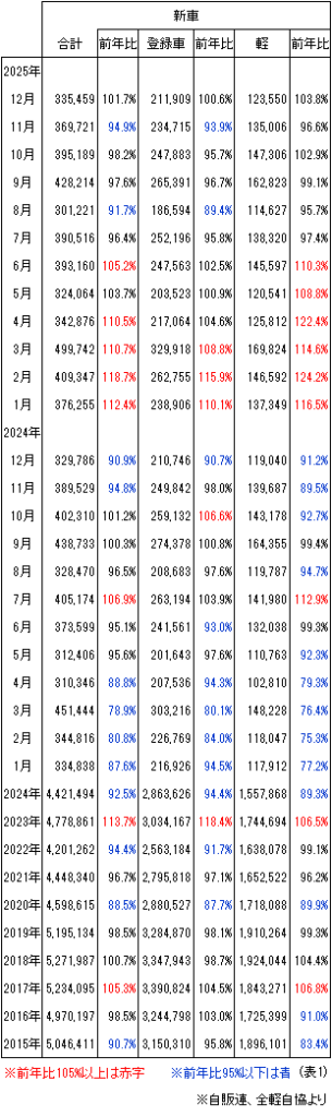 日本自動車販売協会連合会と全国軽自動車協会連合会が発表した12月の新車登録台数は、前年同月比1.7%増の355,459台で6ヶ月ぶりにプラスとなりました。(表1)