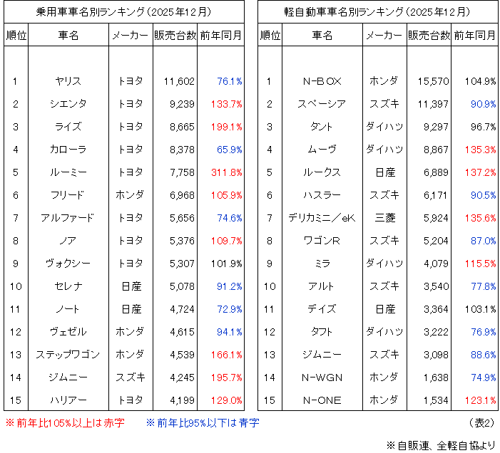 登録車ランキングは15位中、9車種がトヨタ車で11月と同じ車種数となっています。1~5位まではトヨタ車が占め、1位のトヨタ「ヤリス」は16ヶ月連続首位を維持していますが前年同月比76.1%と11月に続き減少、2位にはトヨタ「シエンタ」11月4位から浮上、3位は11月と同じくトヨタ「ライズ」で8,665台前年同月199.1%の台数となっています。