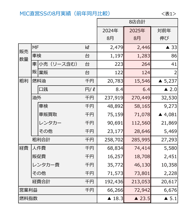 さて、当社のSSの8月の実績を(表1) に示します。