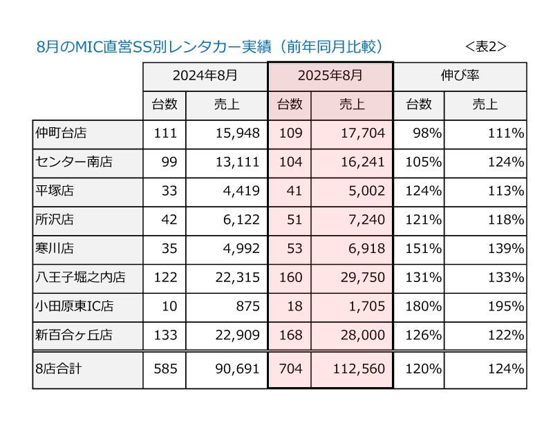 昨年の8月、当社のSSは8店合計580台で臨み、9,000万円を売り上げました。今年の8月は700台で臨み、1.1億円。ついに単月の売上で1億円を越えました(表2)。