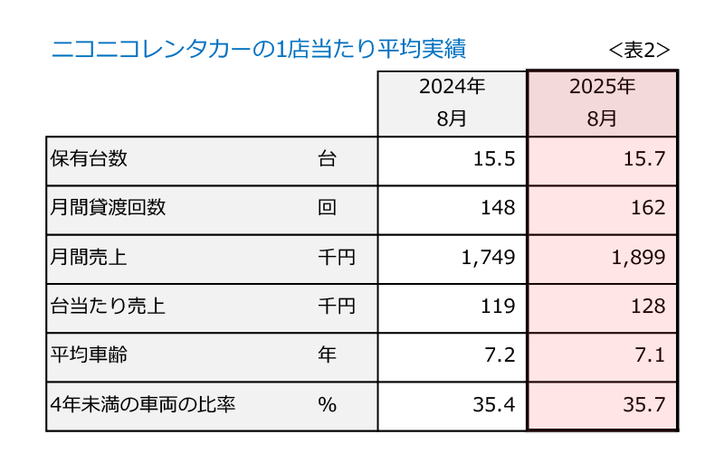 なお、当社が主宰するニコニコレンタカーも、全体的に好調です。1500店近いFC(フランチャイズ・チェーン)店がありますが、8月の1店当たり