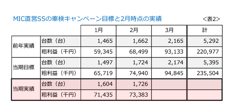 3カ月間で前年を103台、1,450万円上回る目標を掲げましたが、2月時点で中間目標を109台、410万円上回っており、この勢いのまま、本命の3月需要期に突入しています(表2)。