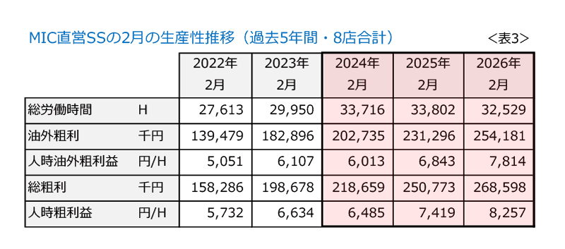 2年前の労働投入時間は3万3,700時間、今年は3万2,500時間。1,200時間を削減しました。しかし油外収益は、2億円から2.5億円へと、2年間で5,000万円改善しました。その結果、1時間当たり油外収益は、6,000円から7,800円へと大きく改善。