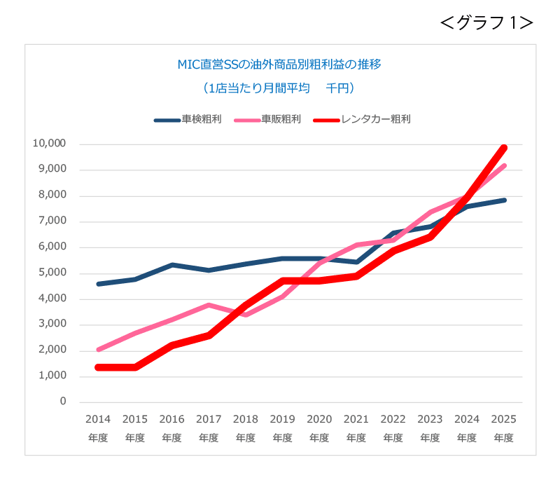 (グラフ1)は、当社のSSの、油外商品別粗利益の1店当たり月間平均額の推移です。