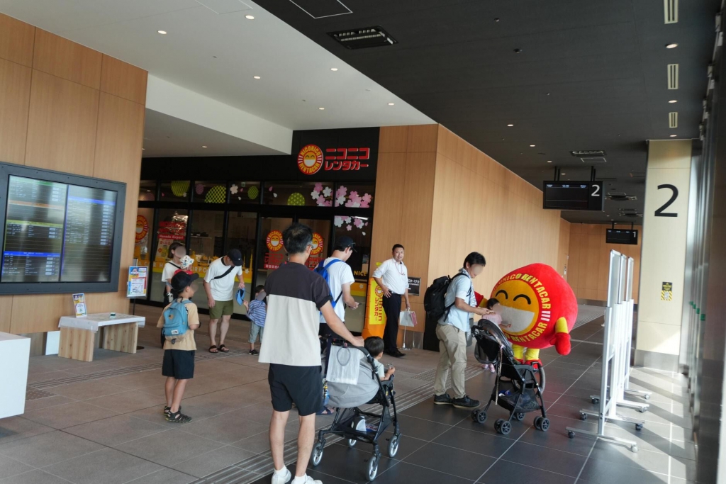 ▲ニコちゃんの登場と同時に子供たちが集合する様子(ニコニコレンタカー羽田空港店前)