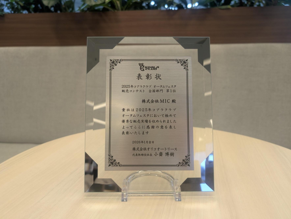 2025年に実施された「コアラクラブ オータムフェスタ」において、当社は販売実績 全国第1位を獲得し、株式会社オリコオートリースより表彰状が授与されました。